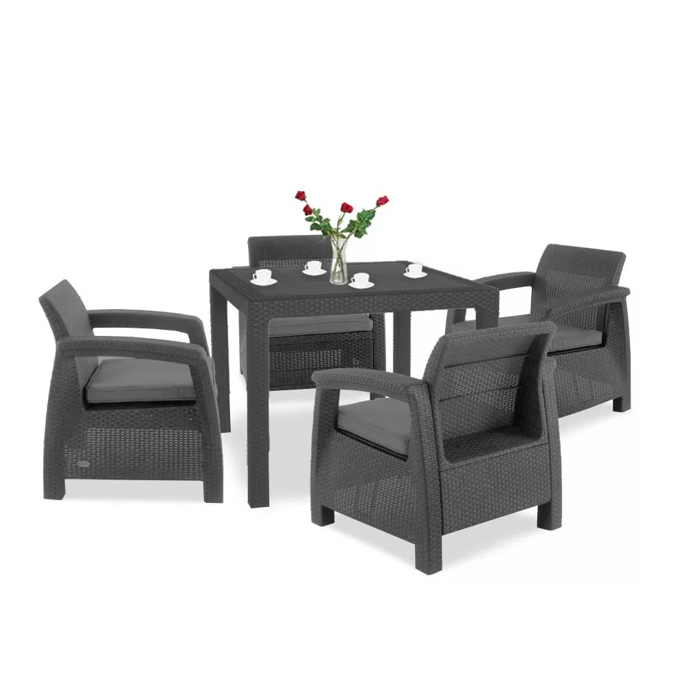 A Corfu Fiesta II Quartet kerti bútor szett tökéletes választás bármelyik udvarra,teraszra, mert pillanatok alatt feldobja azokat. Modern, letisztult kinézete teszi még különlegesebbé kerti bútor garnitúránkat. Karbantartása nem vesz igénybe hosszú időt. Ajánlott egy nedves rongy segítségével áttörölni szükség esetén. Ellenál a szélsőséges időjárási viszonyoknak és az UV sugárzásnka, ennek köszönhetően hosszú ideig élvehetjük eredeti megjelenését kerti bútor szettünknek.