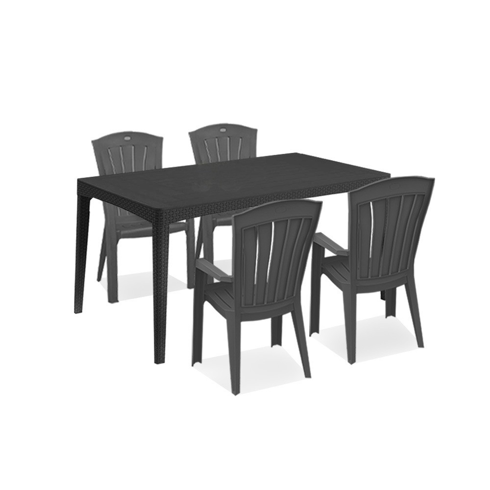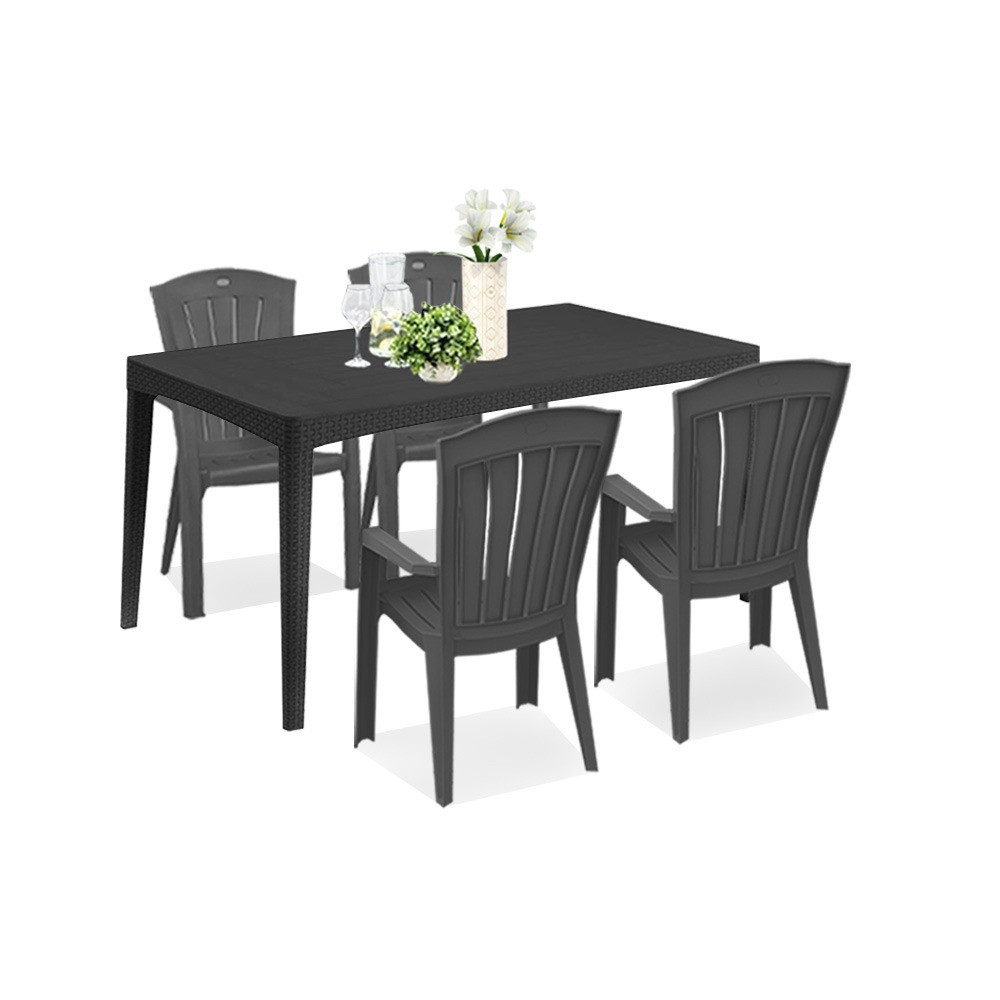 A grafit színű műanyag kerti bútor szett négy darab 61x 65 x 99 cm-es székből és egy 160x 90 x 74 cm-es asztalból áll. Ez egy kiváló minőségű termék, amely a legjobb minőségű fröccsöntött műanyagból készült.
