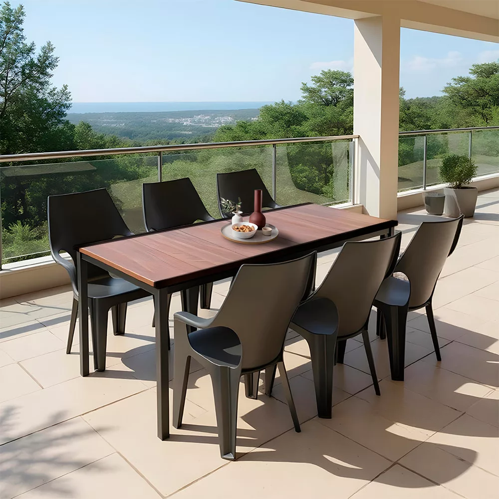 Minden, ami a hétvégi, ráérős brunch-tól a baráti grillpartiig kell: hat Dante magas támlás kartámaszos szék + egy 200 × 95 cm-es Porto étkezőasztal – prémium műanyagból, kompromisszumok nélküli kényelemmel és nulla karbantartással.