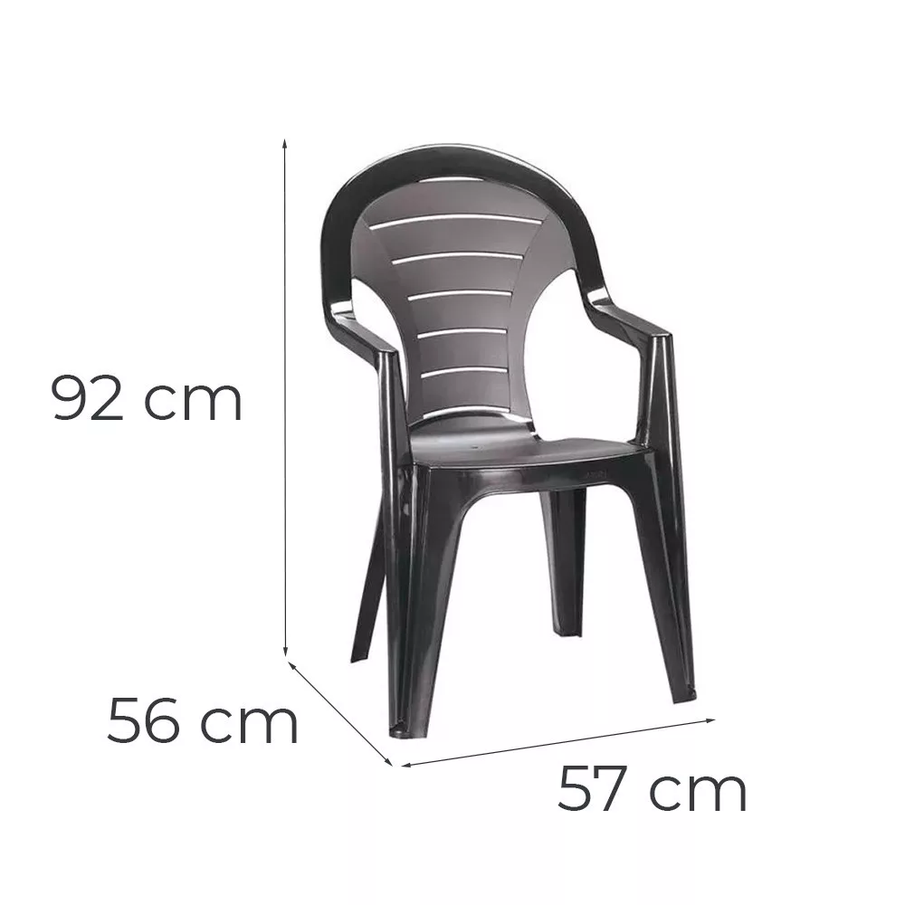 A grafit színű Bonaire székek ergonomikus háttámlája és kartámasza gondoskodik a pihentető ülésről, miközben a rakásolható kialakítás szezonon kívül is minimális helyet igényel. A teljesen műanyag szerkezet korróziómentes, nem igényel festést vagy lakkozást, és ellenáll az esőnek, napsütésnek, fagyoknak is – így egész évben nyugodtan kint hagyhatod őket.