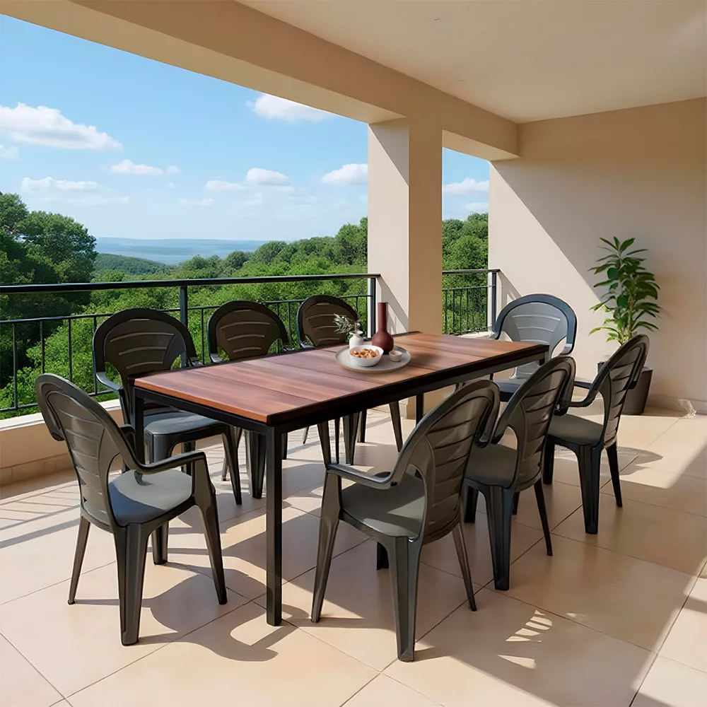 Egyetlen, nagyméretű szettben mindent megkapsz, ami a hétköznapi reggelitől a baráti grillpartiig kell: hat Bonaire rakásolható karfás szék + egy 200 × 95 cm-es Porto étkezőasztal – prémium műanyagból, kompromisszumok nélküli kényelemmel és nulla karbantartással.
