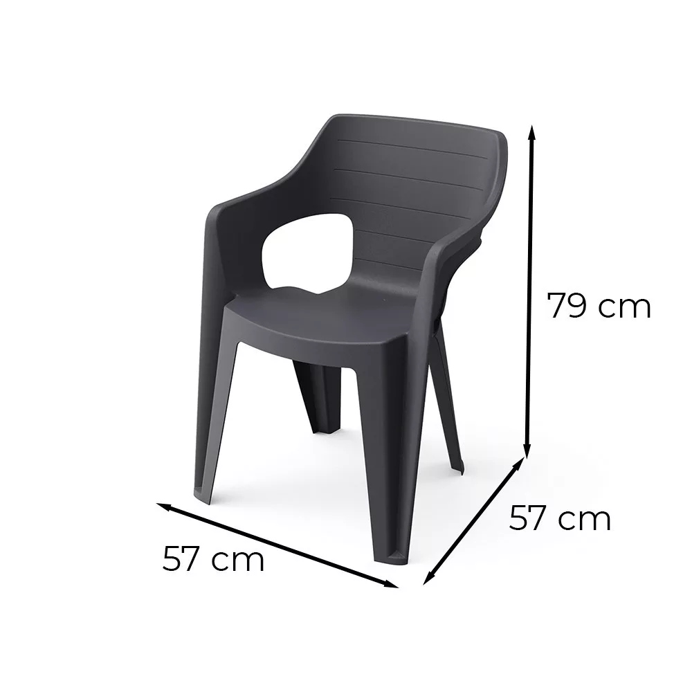 Az ergonomikus, kartámaszos kialakítás kényelmes ülést kínál, miközben a vízelvezető nyílás gondoskodik róla, hogy egy zápor után se maradjon pocsolya az ülőlapon. Ha nincs szükség az összes székre, egyszerűen egymásra rakhatod őket – ideális megoldás kisebb erkélyre, teraszra vagy szezonon kívüli tárolásra. A teljesen műanyag szerkezet korróziómentes és nem igényel festést vagy lakkozást.