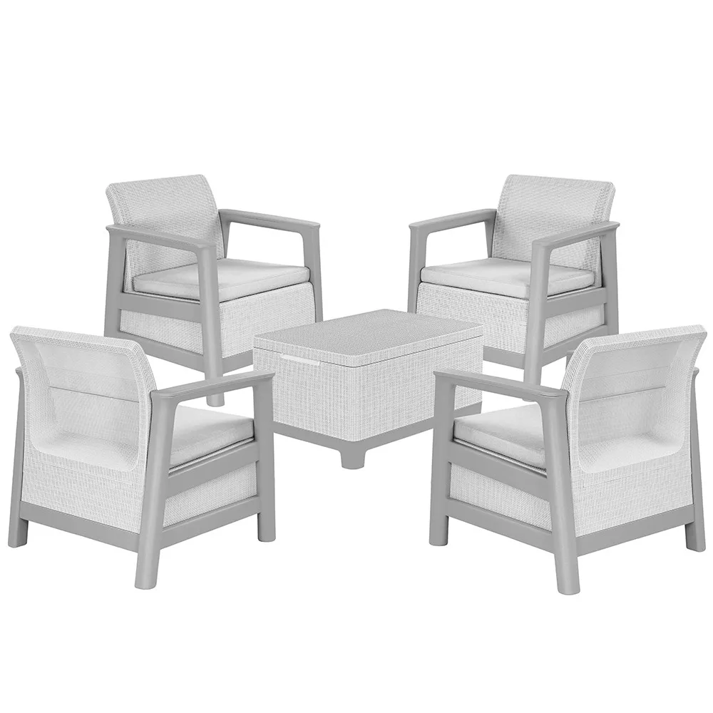 Ideális választás azok számára, akik hamuszürke-világosszürke kerti bútor szettet keresnek, időjárásálló műanyag kültéri bútort szeretnének, kisebb teraszra vagy erkélyre is elhelyezhető kompakt megoldást választanának, illetve előnyben részesítik a tárolóval ellátott kerti asztalt. Stabil, modern és hosszú távon is kényelmes kültéri ülőgarnitúra.