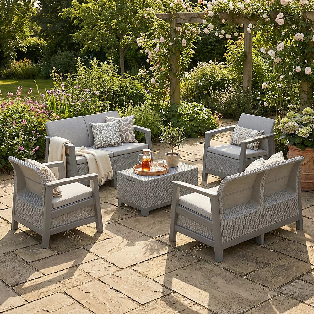A szett kényelmes beszélgetősarkot alakít ki a kertben vagy a teraszon. Egységes, modern kültéri nappali hozható létre vele, miközben a tárolós asztal praktikus helyet biztosít a kiegészítőknek. Időjárásálló, gondozásmentes megoldás, amely rendezetten és átgondoltan formálja a kültéri teret.