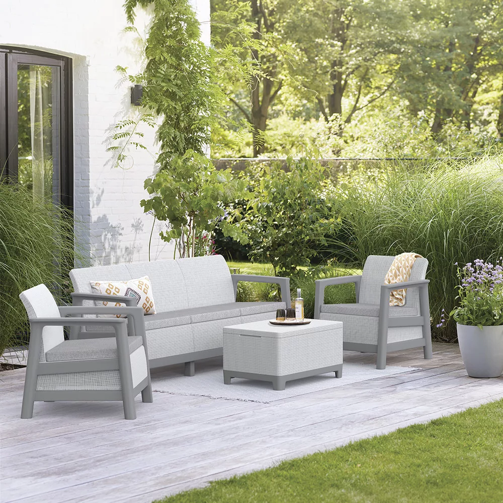 A szett kényelmes beszélgetősarkot alakít ki a kertben vagy a teraszon. Egységes, modern kültéri nappali hozható létre vele, miközben a tárolós asztal praktikus helyet biztosít a kiegészítőknek. Időjárásálló, gondozásmentes megoldás, amely rendezetten és átgondoltan formálja a kültéri teret.