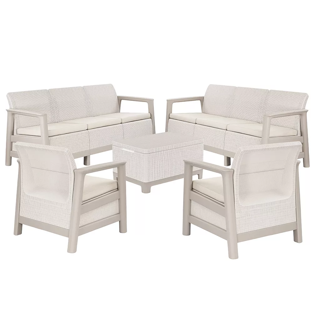 A szett kényelmes beszélgetősarkot alakít ki a kertben vagy a teraszon. Egységes, modern kültéri nappali hozható létre vele, miközben a tárolós asztal praktikus helyet biztosít a kiegészítőknek. Időjárásálló, gondozásmentes megoldás, amely rendezetten és átgondoltan formálja a kültéri teret.