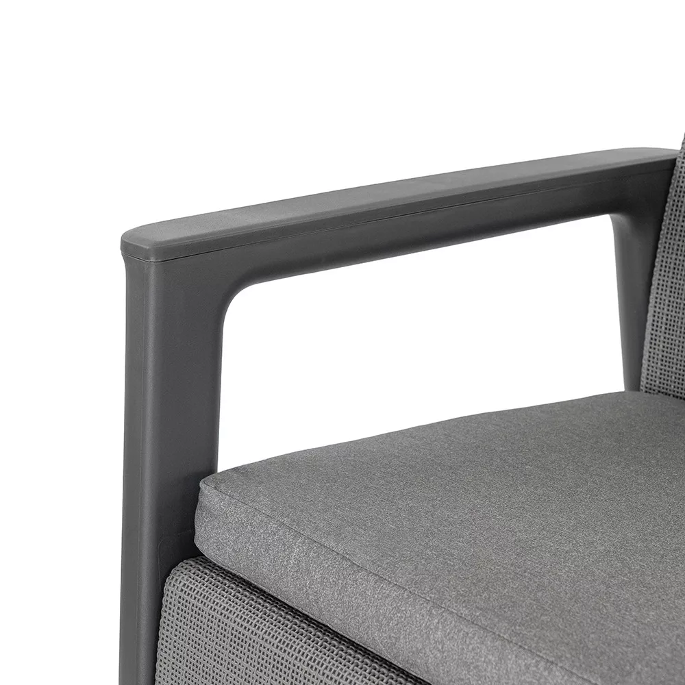 A szett kényelmes beszélgetősarkot alakít ki a kertben vagy a teraszon. Egységes, modern kültéri nappali hozható létre vele, miközben a tárolós asztal praktikus helyet biztosít a kiegészítőknek. Időjárásálló, gondozásmentes megoldás, amely rendezetten és átgondoltan formálja a kültéri teret.