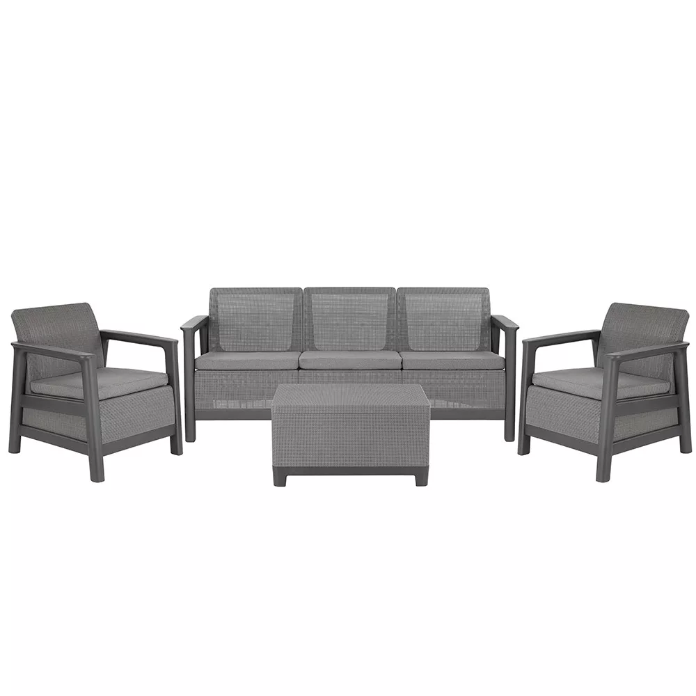 A szett kényelmes beszélgetősarkot alakít ki a kertben vagy a teraszon. Egységes, modern kültéri nappali hozható létre vele, miközben a tárolós asztal praktikus helyet biztosít a kiegészítőknek. Időjárásálló, gondozásmentes megoldás, amely rendezetten és átgondoltan formálja a kültéri teret.