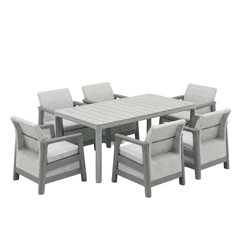 Ideális választás azok számára, akik hamuszürke-világosszürke kerti bútor szettet keresnek, időjárásálló műanyag kültéri bútort szeretnének, kertbe, teraszra vagy erkélyre. Stabil, modern és hosszú távon is kényelmes kültéri ülőgarnitúra.