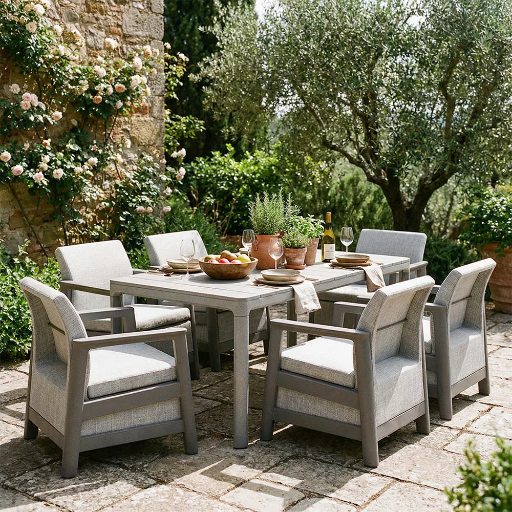 A szett kényelmes beszélgetősarkot alakít ki a kertben vagy a teraszon. Egységes, modern kültéri nappali hozható létre vele, miközben a nagyméretű kerti asztal stabil felületet biztosít étkezésekhez és közös programokhoz. Időjárásálló, gondozásmentes megoldás, amely rendezetten és átgondoltan formálja a kültéri teret.