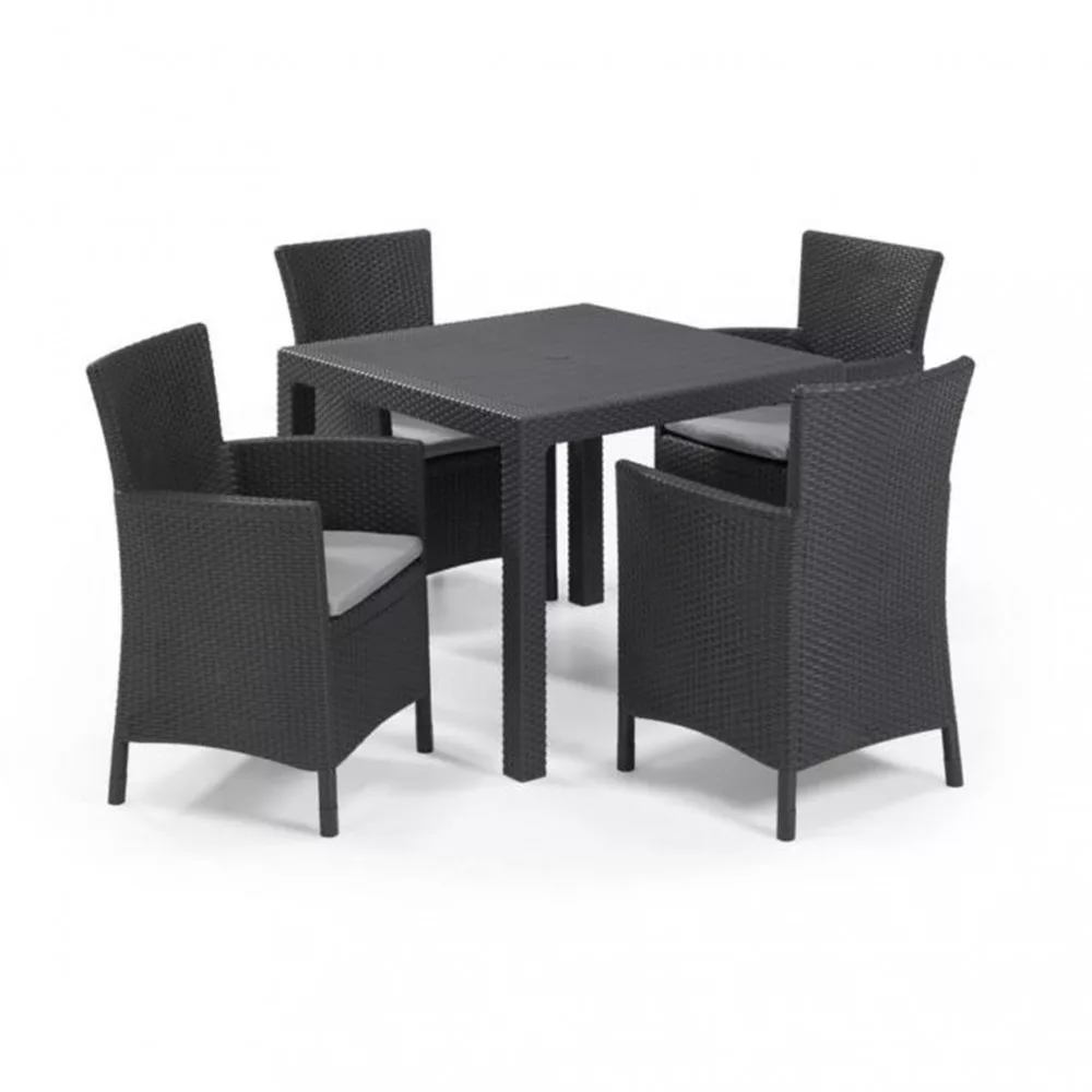 Quartet kerti bútor szett; amely tartalmaz egy Quartet asztalt és négy darab Iowa karfás széket a hozzá tartozó párnával. Az eredeti; rattan-szerű felület meg fog felelni még a legigényesebb felhasználók számára is. A termék nagyon könnyen összeszerelhető és karbantartható. A bútorok felülete ellenálló a nedvességgel és az UV sugárzással szemben; ami hosszú élettartamot garantál. A rattanbútor lapra szerelve érkezik.