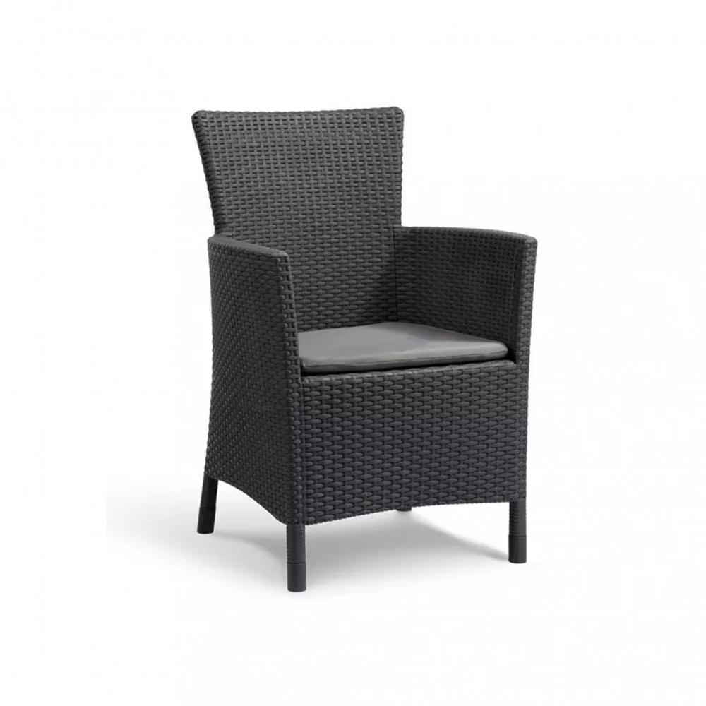 Az elegáns Rattan Style Iowa DC kerti fotel elegáns és sokoldalú felszerelés, ideális otthonához, kertjéhez vagy teraszához. A fotel nagyon tartós és megfelel a legigényesebb emberek szabványainak is. A bútorokat az Allibert gyártotta, amely egy csoportban működik olyan vállalatokkal, mint például a Keter vagy a Curver, és magas szintű műanyag berendezéseket kínál. A nagy és kényelmes Iowa fotel a kertben tökéletes lesz nem csak magánházban, hanem étteremkertben vagy egy elegáns szállodában is .Könnyen tisztítható, elegáns, mégis tartós és stabil, így biztonságosan használhatja. Ülőpárnát küldünk a kerti székkel. A párnák színe kissé különbözik a bútoroktól - egy barna taupe párna van a barna karosszékhez rögzítve, míg a grafit karosszékkel ellátott készletben egy szürke párnát kapunk. Ez a finom színkülönbség pozitív hatással van a készlet megnyilvánulására.A bútor nem érzékeny a káros időjárási viszonyokra, és ellenáll az UV sugaraknak is . Az Iowa DC kerti szék nem veszíti el a színét , így hosszabb ideig megőrzi eredeti kinézetét.