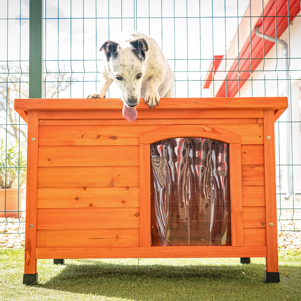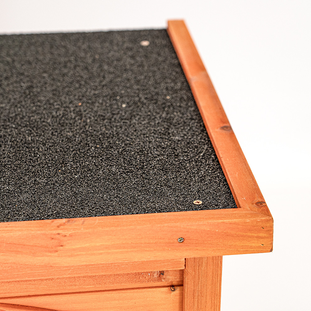 Az egyik legfontosabb jellemzője ennek a kutyaháznak a lapos tető, amely lehetővé teszi, hogy a házat szűkös helyre is könnyedén elhelyezezzük. Ezenkívül a tetőtúlnyúlások megvédenek mindent az esőtől. Az állítható magasságú gumisapkák a kutyaház talpán biztosítják a stabilitást, és megvédik azt a nedvességtől, miközben lehetővé teszik a levegő áramlását a házikó alatt, ami kiválóan védi kedvencét a talaj hidegétől és nedvességétől.