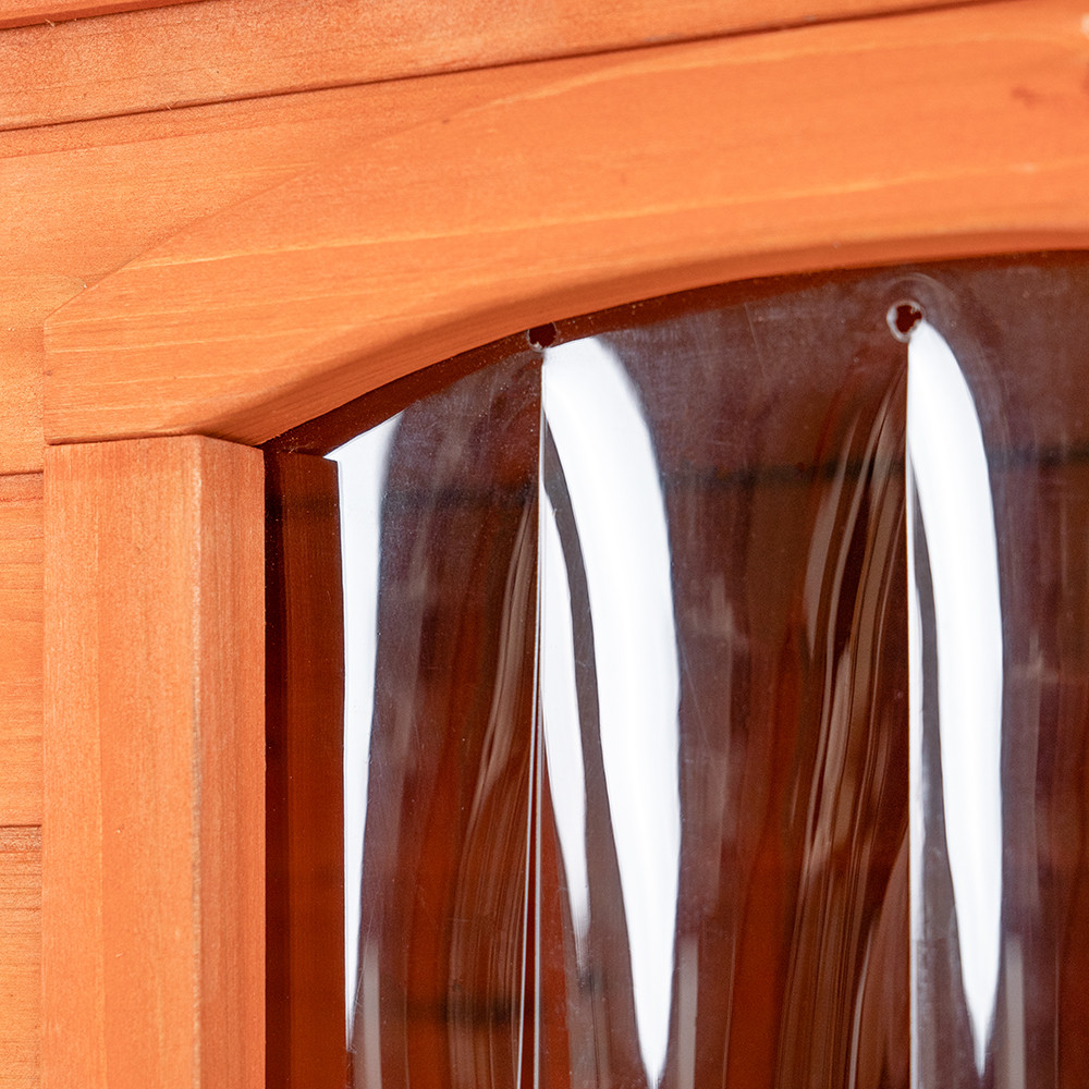 A kutyaház műanyag ajtaja további védelmet nyújt hideg ellen, és távol tartja az esőt és a szelet. Az ajtó lamellás kialakítása könnyű belépést és kilépést biztosít a kutyának. A bejárat méretei: 25(széles)x36(magas) cm.