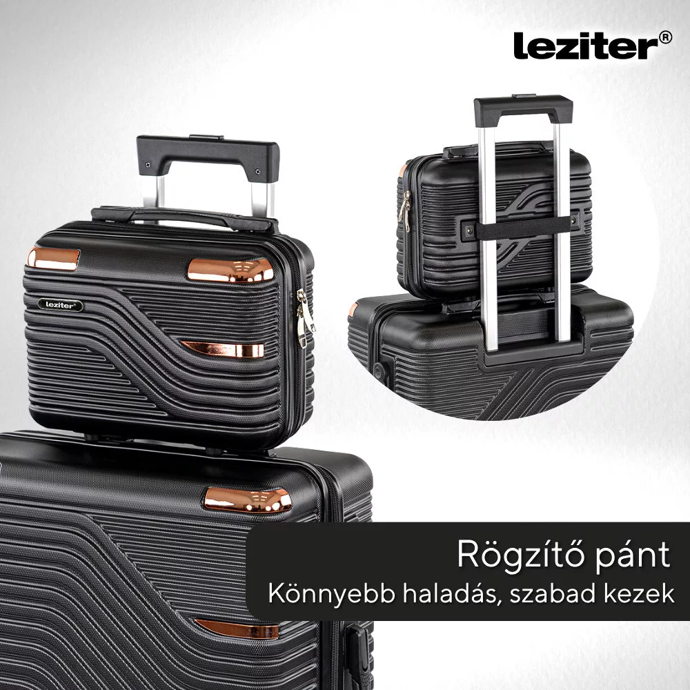 - Rögzítés: A kézi bőrönd és neszesszer hátoldali pánttal rögzíthető a nagy bőrönd húzószárára
