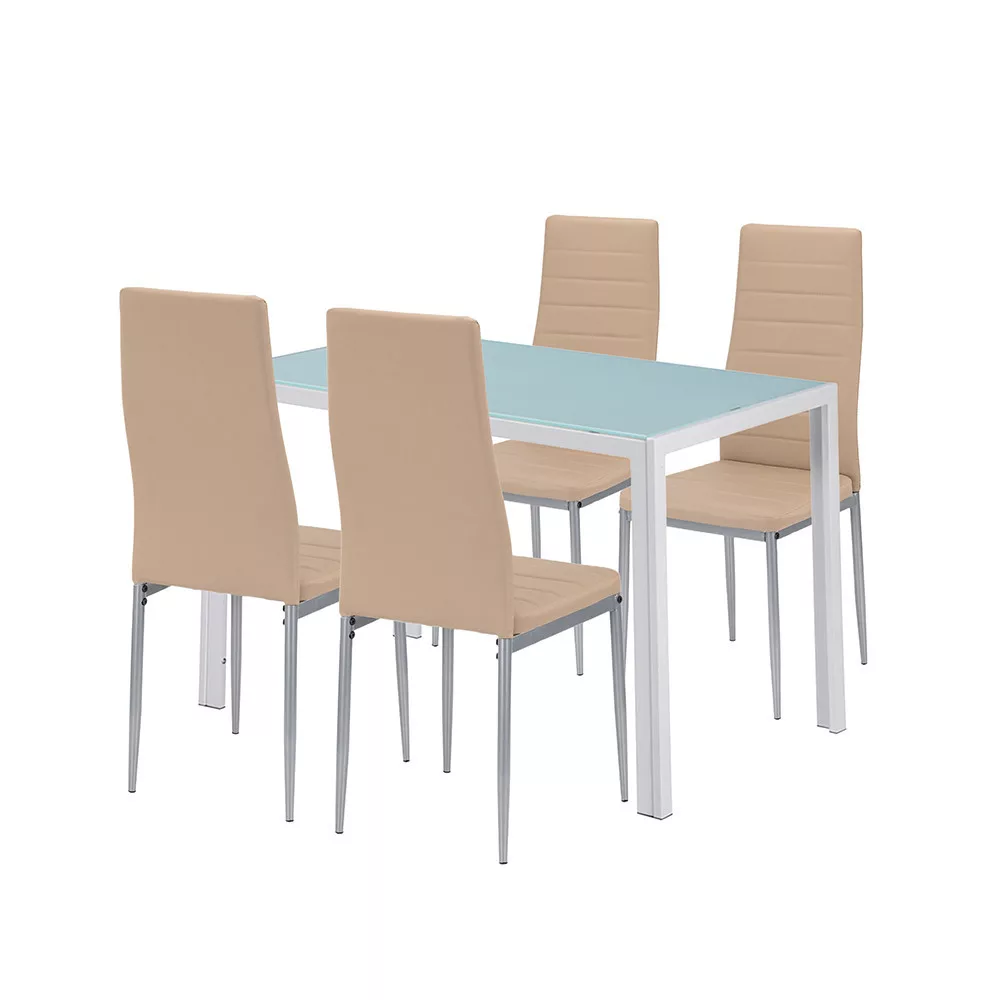 A textilbőr székek elegáns megjelenése és a puha párnázottság kellemes ülésélményt nyújt, míg az üveglapos asztal légies, modern hatást kelt a térben. A tartósságot a masszív fémváz és a karcálló üveglap garantálja.