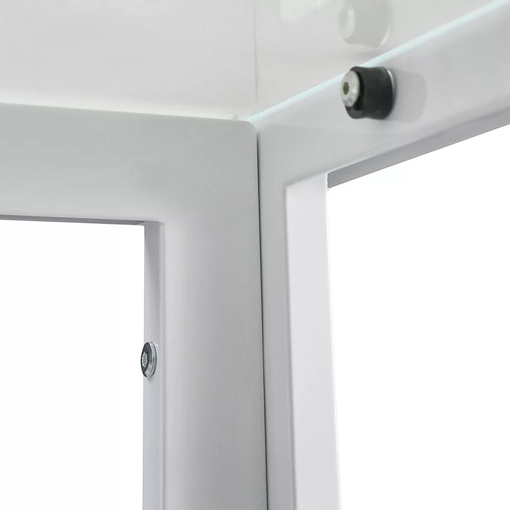 Az üvegfelület elegáns hatást kelt és könnyen tisztítható. A fehér fém lábak stabilitást adnak az asztalnak, és világosabbá, letisztultabbá teszik a teret. Méretének köszönhetően kisebb és nagyobb étkezőkben is jól elfér.