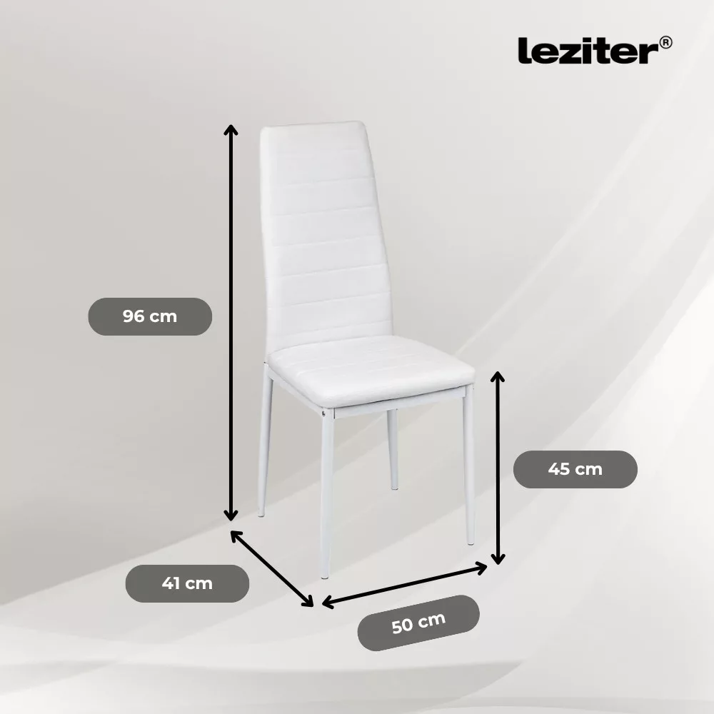 A garnitúrához tartozó Tino Nova székek fehér textilbőr kárpittal és fehér fémlábakkal készültek – ez a klasszikus árnyalat bármilyen enteriőrben jól mutat, miközben igazán elegáns megjelenést nyújt. A tervezés során nagy hangsúlyt kapott a kényelem: az ergonomikus háttámla és az ideális, 45 cm-es ülőmagasság hosszabb ülések során is kényelmet biztosít.