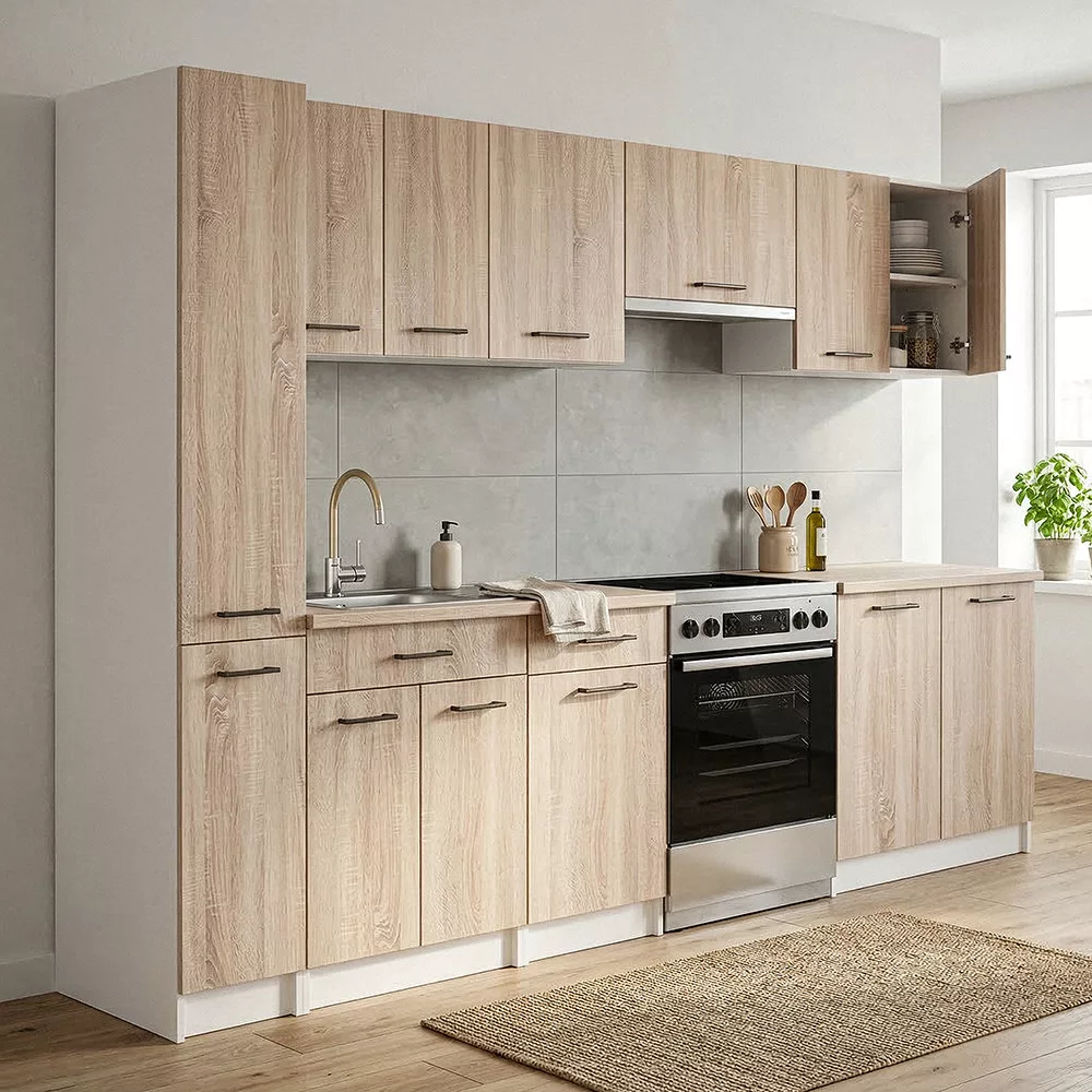 A Praktik konyhabútor fehér korpusszal és sonoma tölgy fronttal időtálló, letisztult megjelenést kínál, amely könnyedén illeszkedik bármilyen lakberendezési stílushoz. Világos színvilága optikailag tágítja a teret, így ideális választás különböző méretű konyhákba.