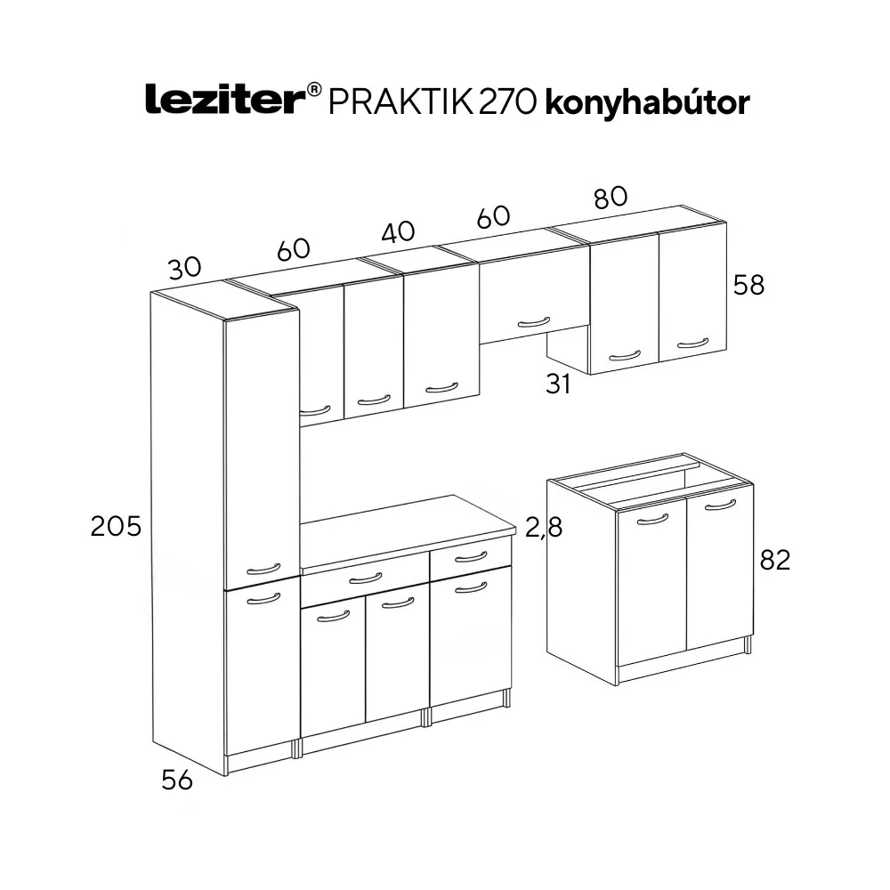 A Praktik konyhabútor egyszerű szerkezettel rendelkezik, így gyorsan és könnyedén összeállítható, ami különösen előnyös költözés vagy felújítás során. A moduláris rendszer lehetővé teszi, hogy a konyha elrendezése igény szerint módosítható vagy később további elemekkel bővíthető legyen.