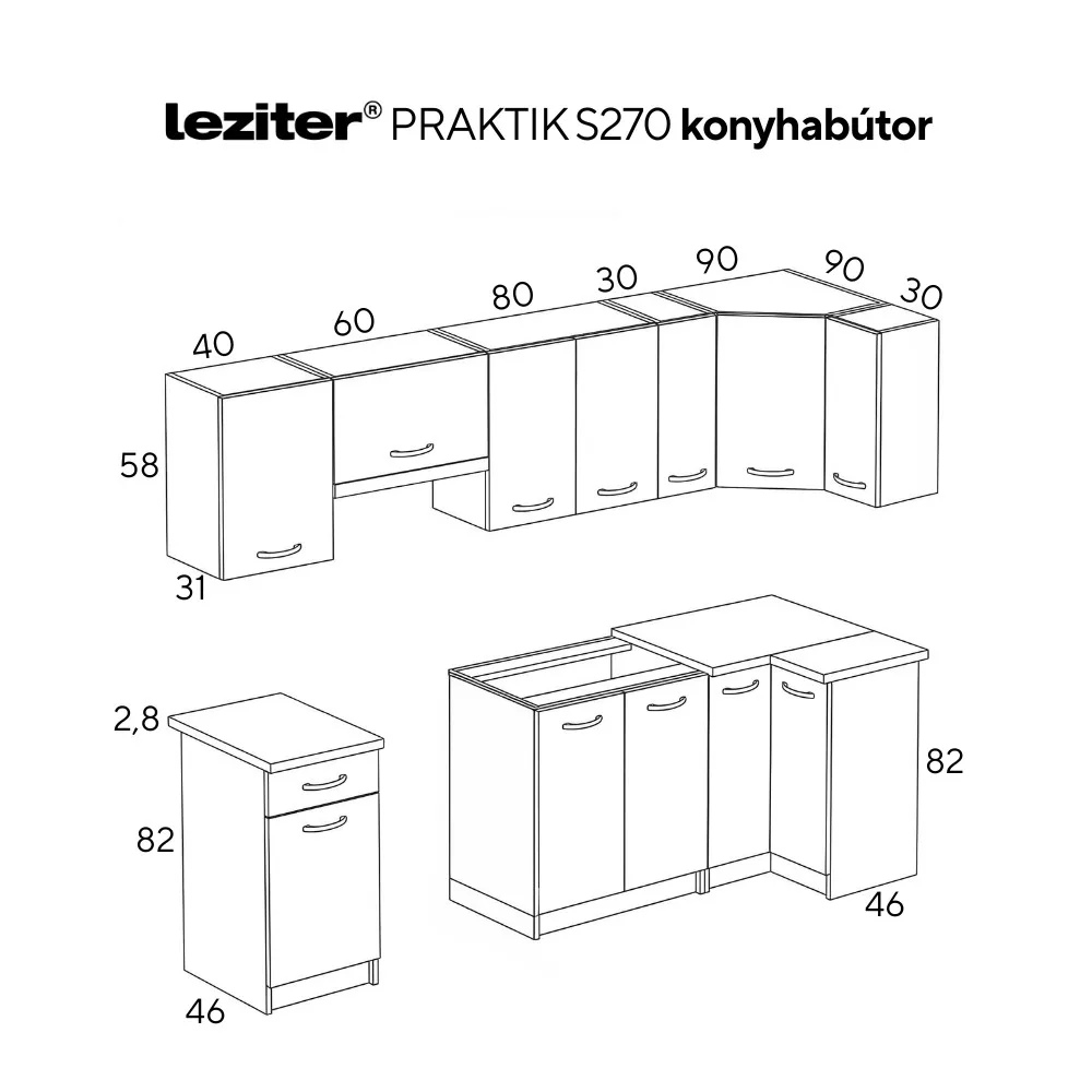 A Praktik sarok konyhabútor egyszerű szerkezettel rendelkezik, így gyorsan és könnyedén összeállítható, ami különösen előnyös költözés vagy felújítás során. A moduláris rendszer lehetővé teszi, hogy a konyha elrendezése igény szerint módosítható vagy később további elemekkel bővíthető legyen.