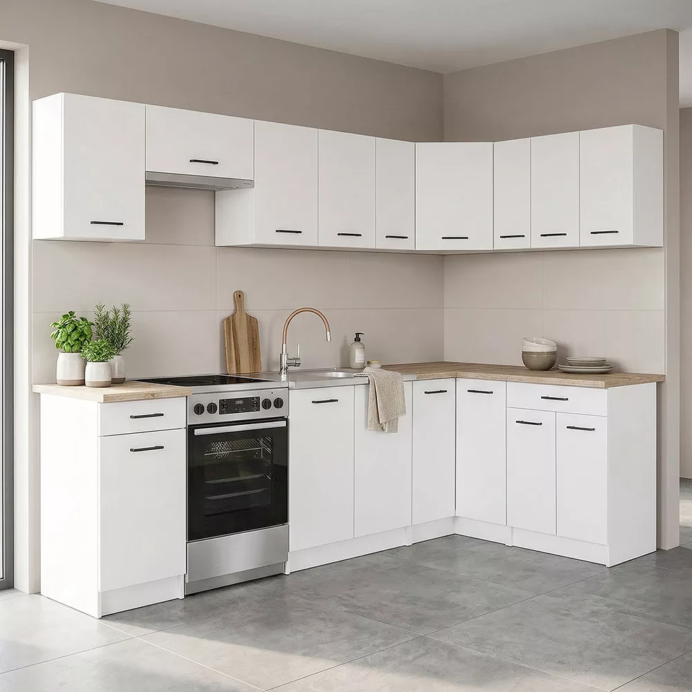 A Praktik sarok konyhabútor fehér korpusszal és fehér fronttal időtálló, letisztult megjelenést kínál, amely könnyedén illeszkedik bármilyen lakberendezési stílushoz. Világos színvilága optikailag tágítja a teret, így ideális választás különböző méretű konyhákba.