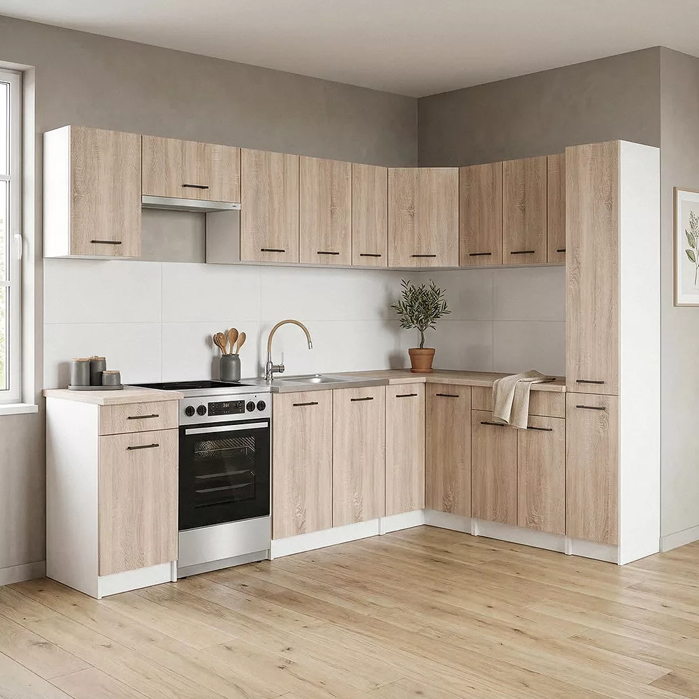 A Praktik sarok konyhabútor fehér korpusszal és sonoma tölgy fronttal időtálló, letisztult megjelenést kínál, amely könnyedén illeszkedik bármilyen lakberendezési stílushoz. Világos színvilága optikailag tágítja a teret, így ideális választás különböző méretű konyhákba.