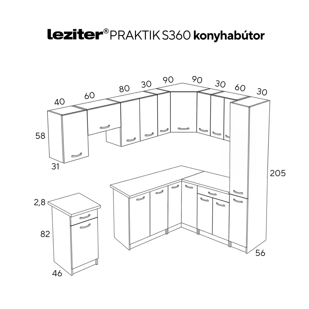 A bútor 16 mm vastag laminált bútorlapból készül, amely ellenáll a mindennapi használat során jelentkező igénybevételnek, miközben könnyen tisztítható felületet biztosít. A 28 mm-es munkalap színazonos dekor élzárással stabil és tartós munkafelületet kínál, amely hosszú távon is megőrzi esztétikus megjelenését.
