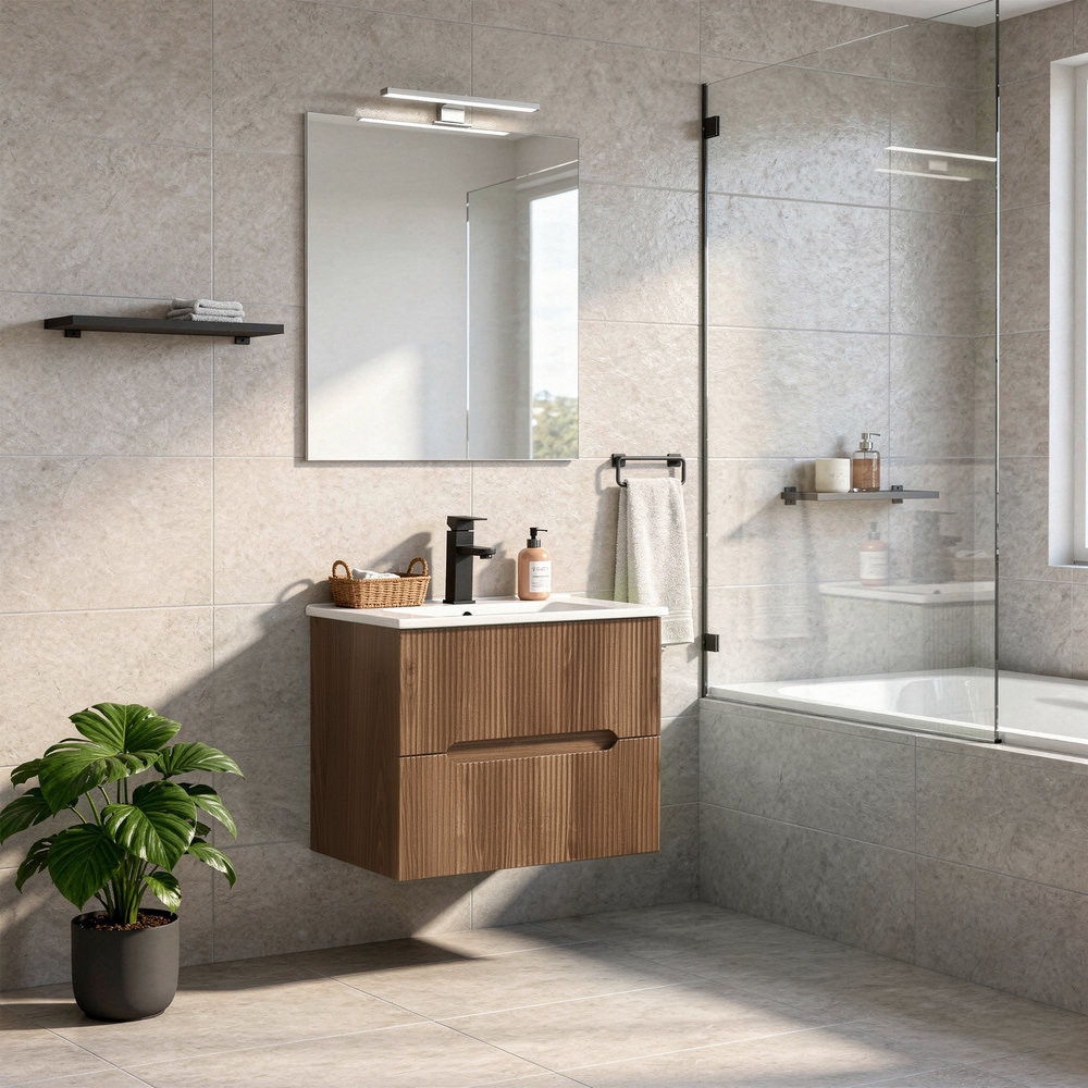 A Trent 60 szekrény magas minőségű MDF bútorlapból készült, amely az egyik legmegbízhatóbb anyag, ha fürdőszobai használatról van szó. Az MDF (Medium Density Fibreboard) sűrű, homogén szerkezetének köszönhetően kiválóan ellenáll a párának, nem vetemedik, és sima, precíz felületet biztosít – ez teszi lehetővé a látványos bordázott dizájn tökéletes kivitelezését is.