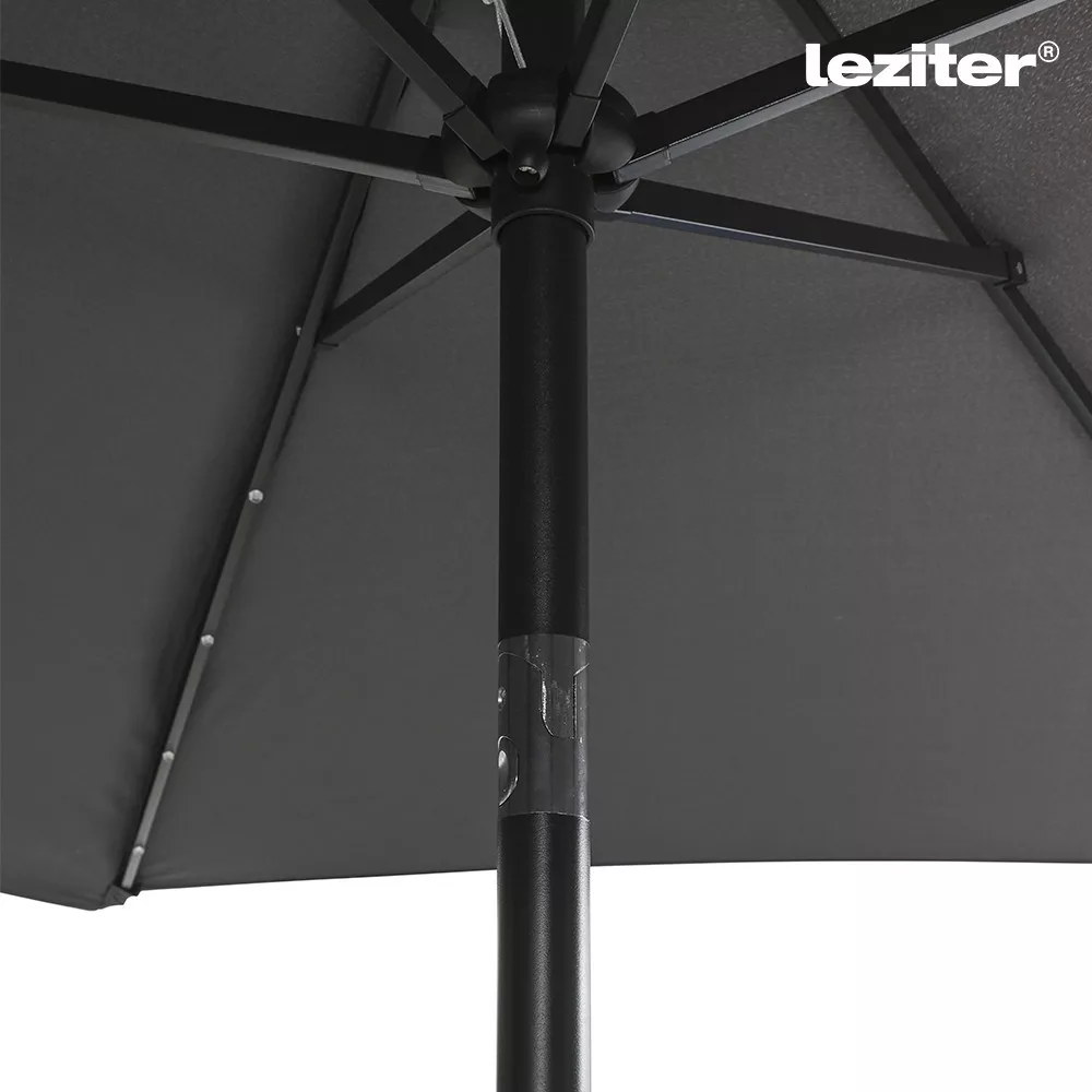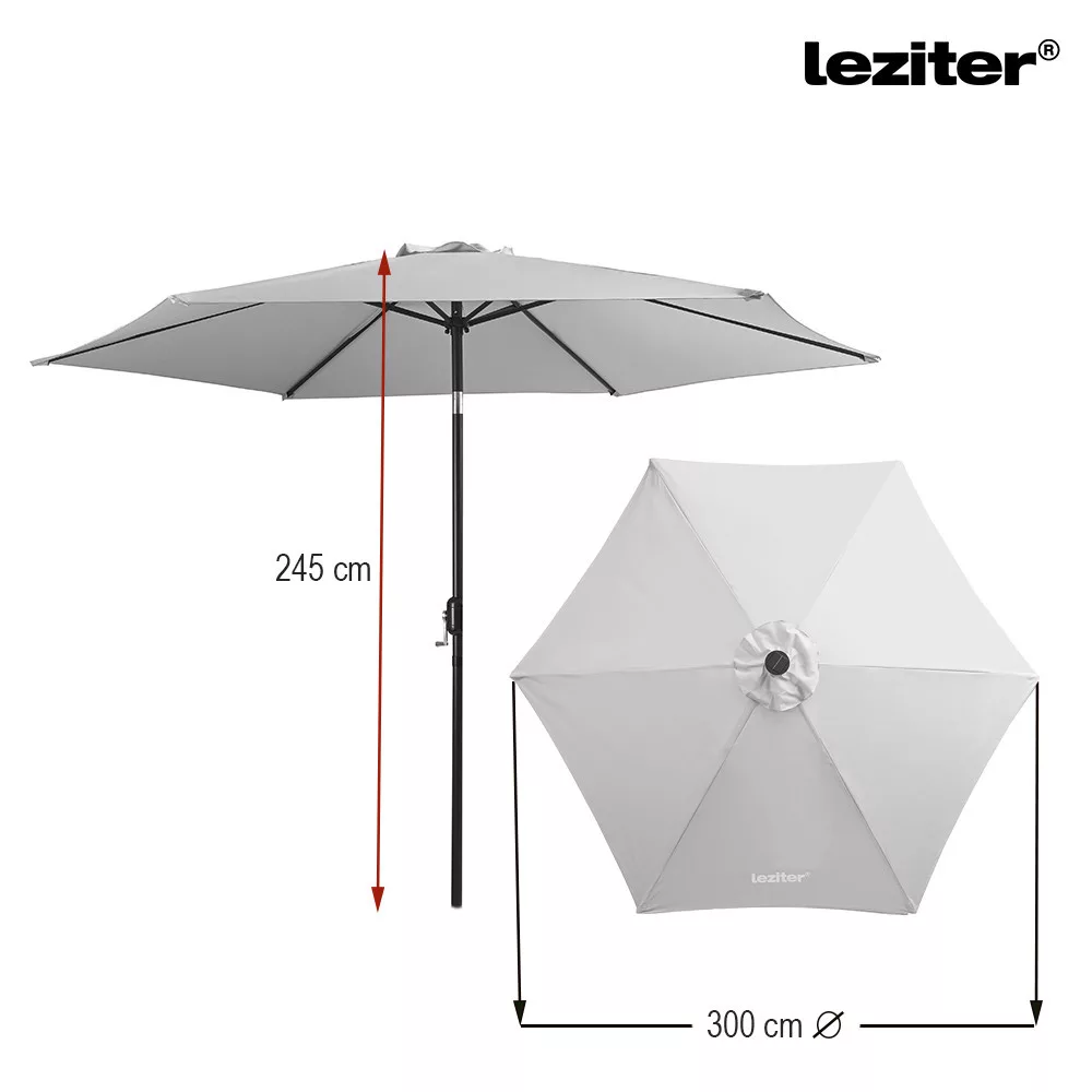 A Leziter Solari kerti napernyő 300 cm átmérőjű kialakítással rendelkezik, amely egyenletes lefedést biztosít a középoszlop körül. A kör alakú forma jól használható kertekben, teraszokon vagy kerti bútorok fölött. A ponyva kialakítása a mindennapi kültéri használathoz igazodik, felülete vízlepergető, így a nedvesség nem szívódik fel azonnal. A szürke szín világos, visszafogott megjelenést ad, amely könnyen illeszkedik különböző kültéri környezetekhez.
