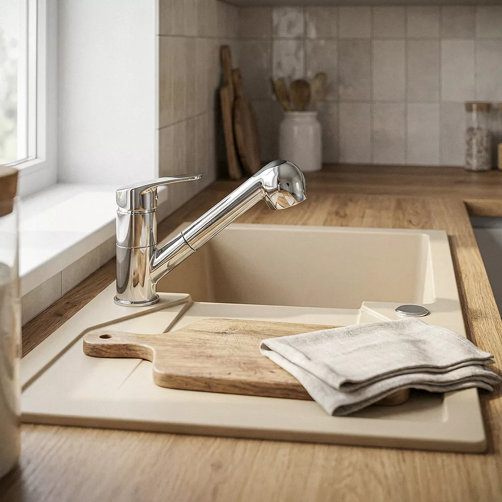 A Carol króm csaptelep különlegessége, hogy színe és textúrája illeszkedik a króm gránit mosogatókhoz. A finom, szeplős mintázat és a selyemfényű felület természetes, harmonikus összhatást teremt, így a csaptelep nemcsak használati eszköz, hanem a konyha látványeleme is.